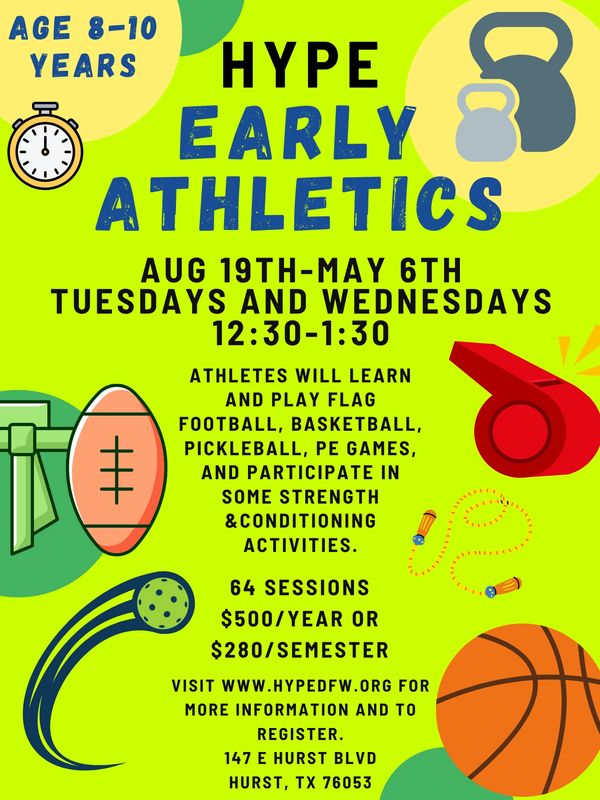 HYPE Early Athletics will give athletes ages 8-10 the opportunity to learn and experience multiple competitive sports, teamwork, sportsmanship, and gain physical literacy in a fun, safe environment.