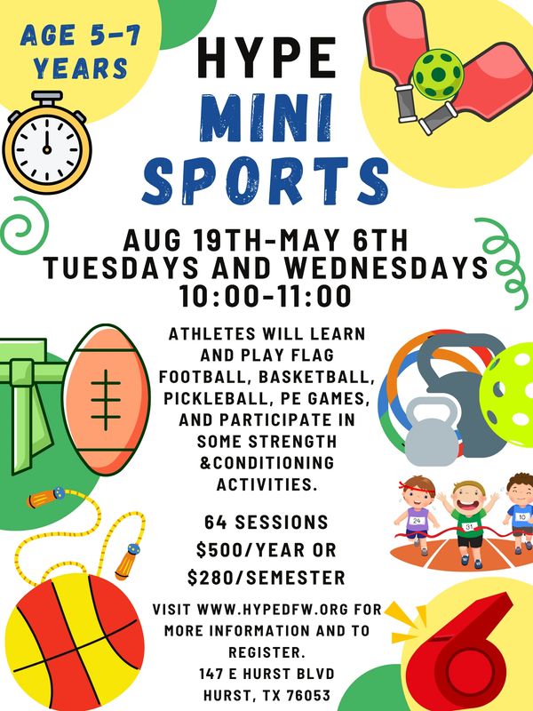 HYPE Mini Sports will give athletes ages 5-7 the opportunity to learn and experience multiple competitive sports, teamwork, sportsmanship, and gain physical literacy in a fun, safe environment.